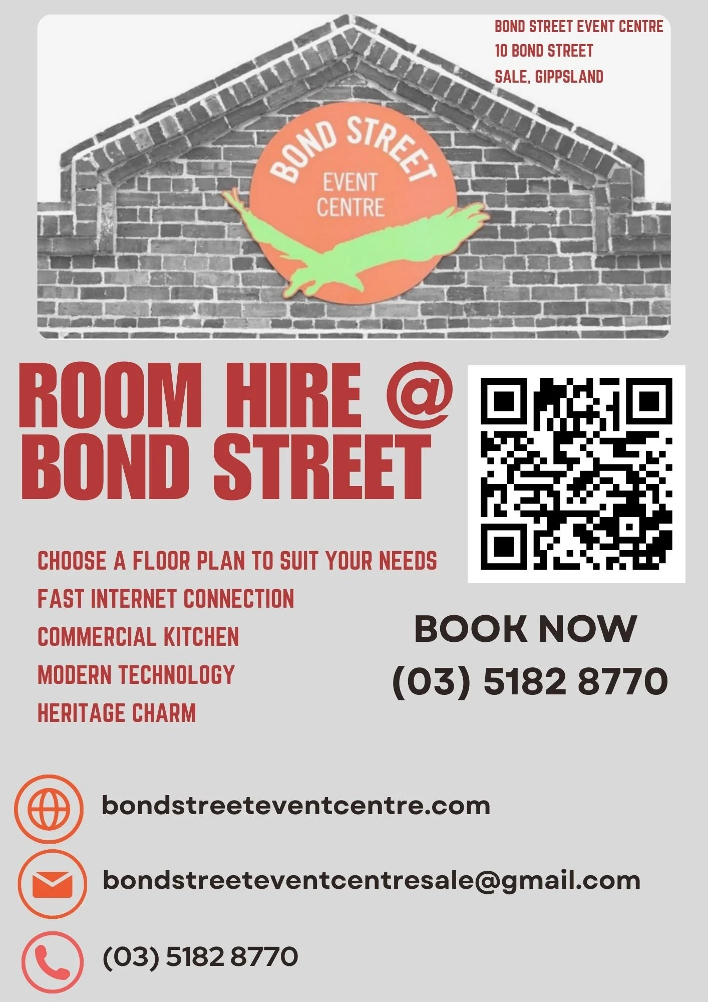 When you choose to hire Bond Street Event Centre, you are supporting the provision of social activities and projects in the local community. While we are a small venue, we offer customers a unique blend of heritage charm and modern technology. Our clients also have exclusive use of the venue, free from interruptions